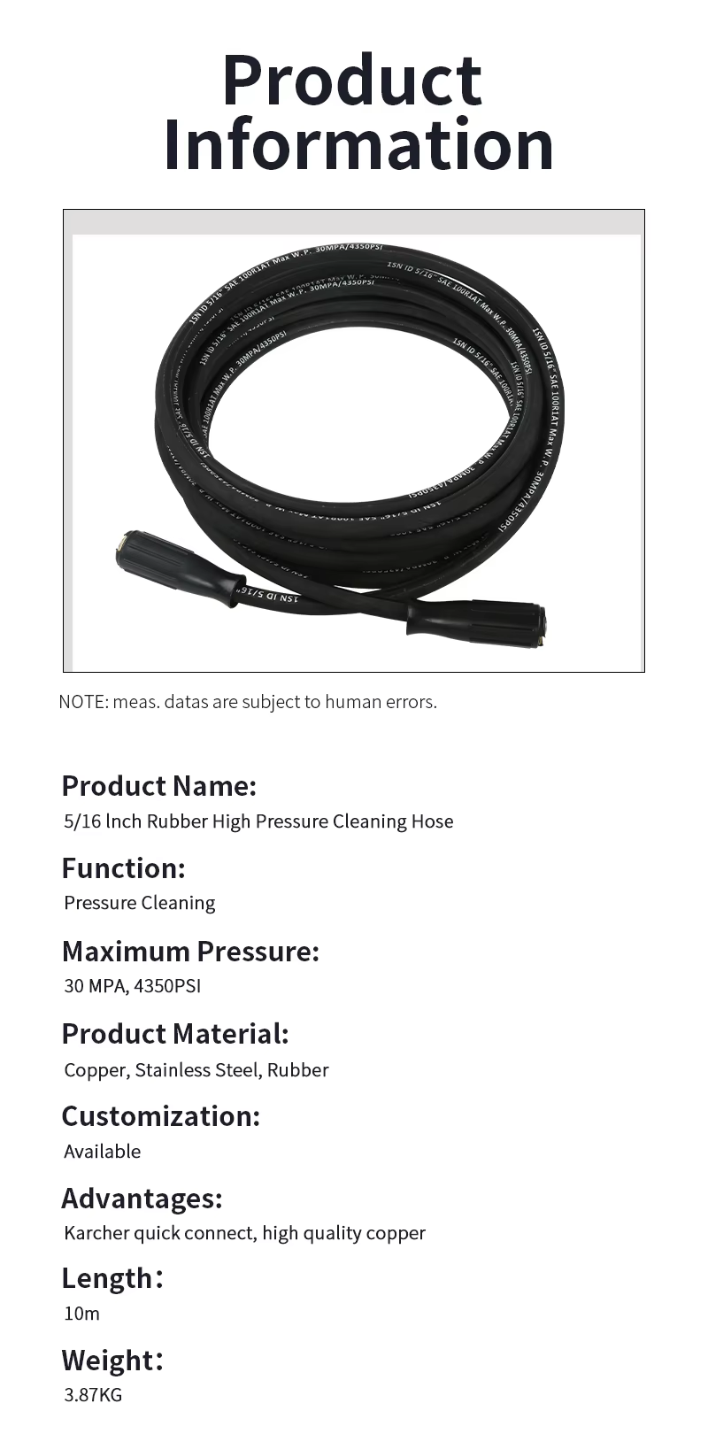 SPS 5/16 инча 33 фута 4350 PSI 30 MPA гумен маркуч с високо налягане от мед и неръждаема стомана за почистване под налягане