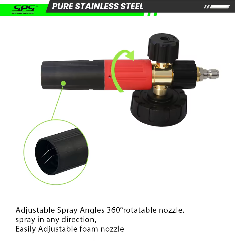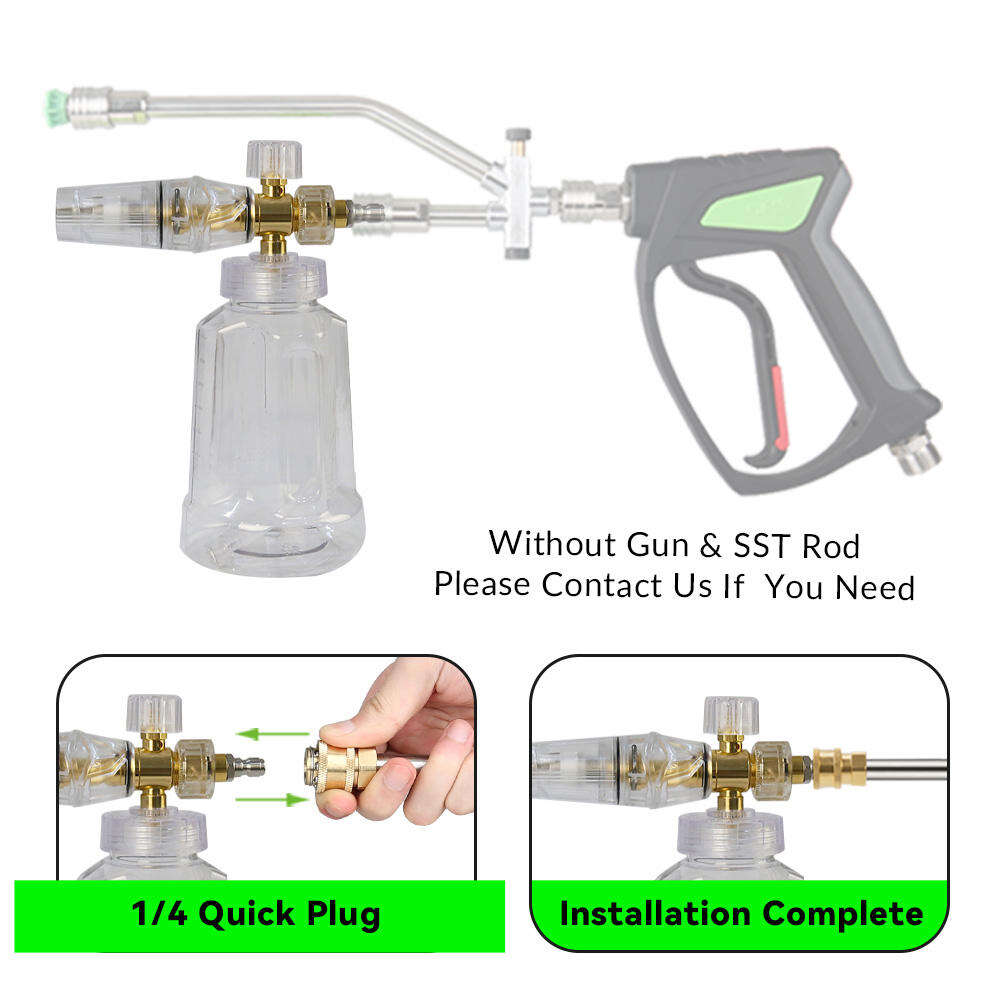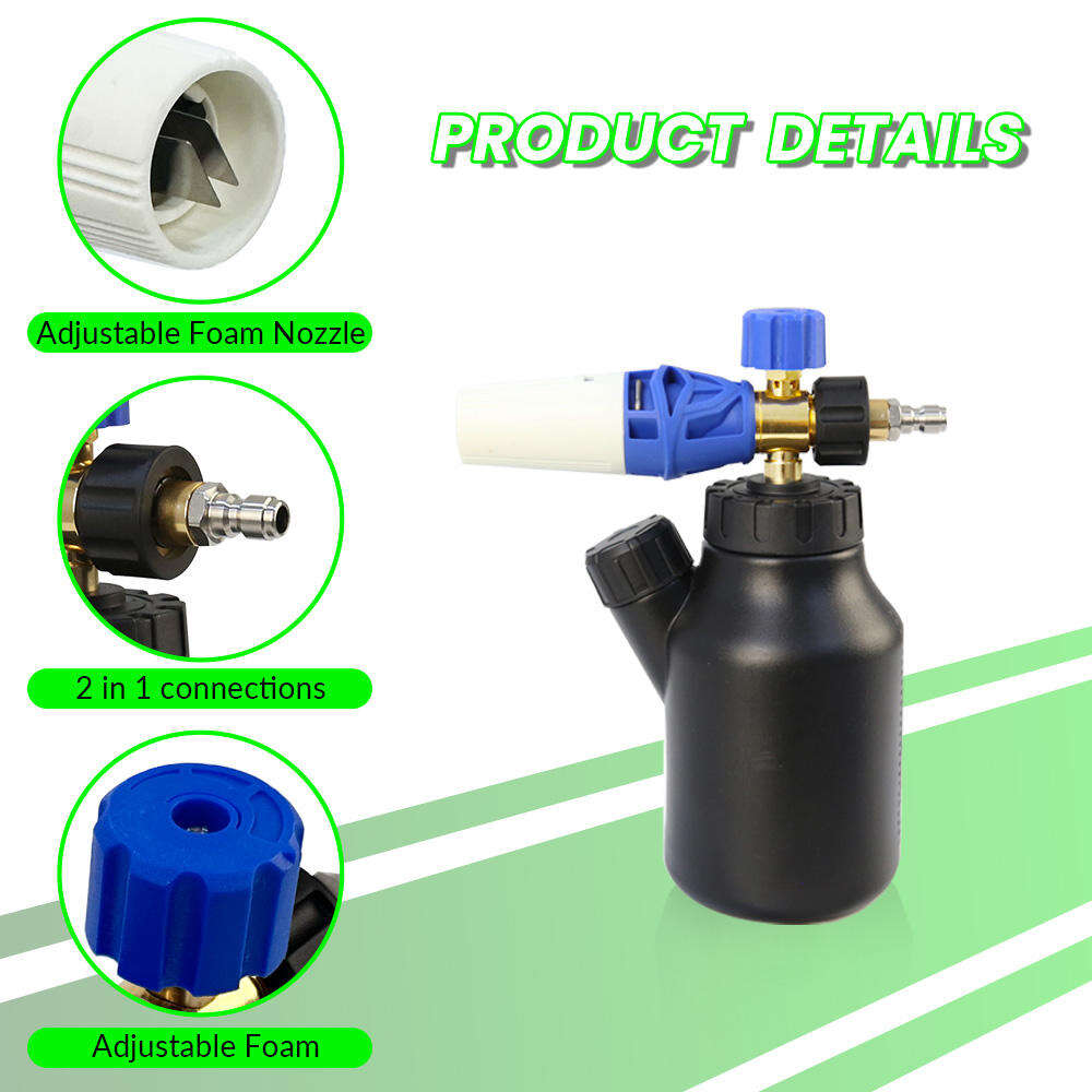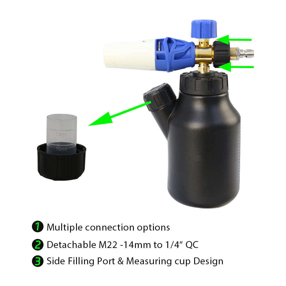 Cañón de espuma de nieve con llenado lateral, cañón de espuma ajustable de 1 L para limpieza de coches, lanza pulverizadora con conexión rápida M22-14 mm y 1/4 de pulgada