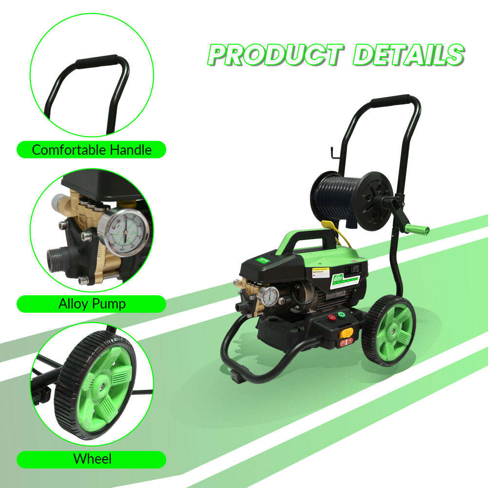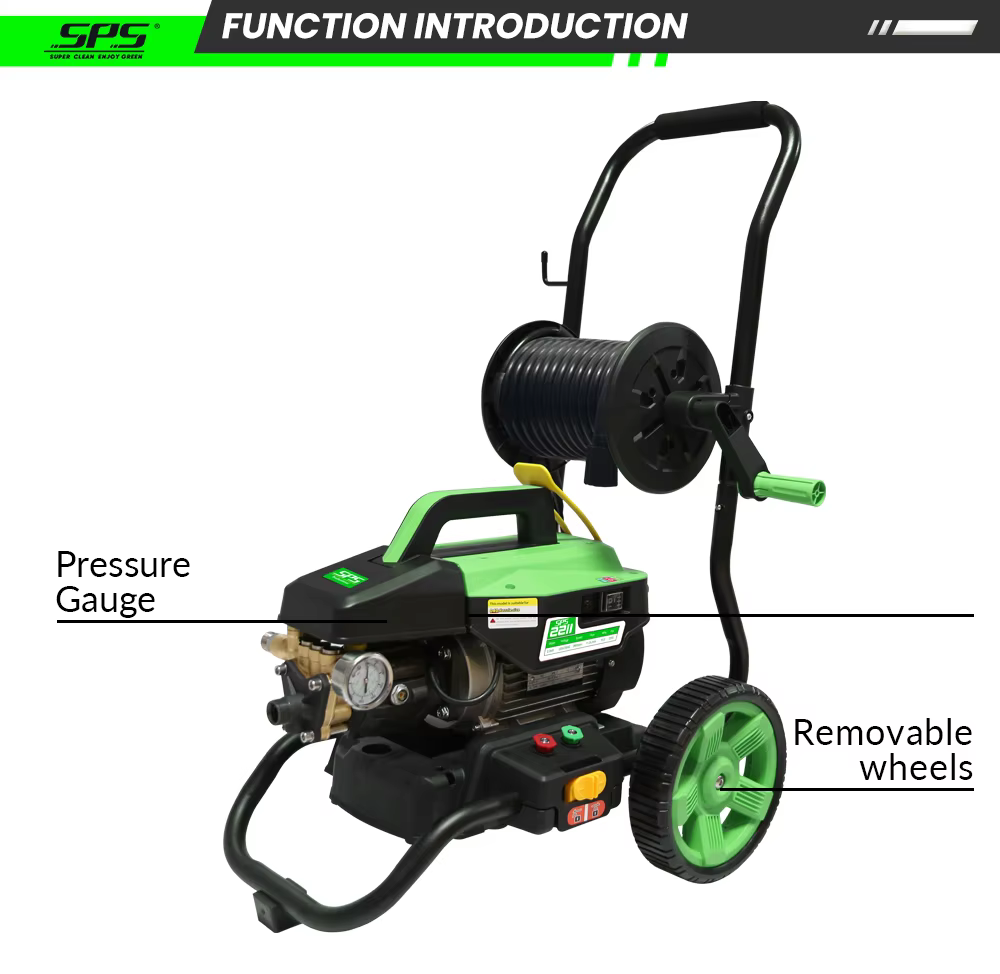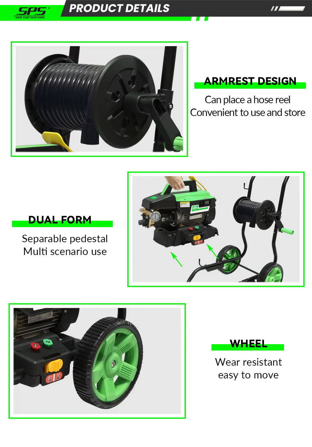 SPS 3000w 携帯型オートマチック2 in 1機能 150Bar カーウォッシャークリーナー 二輪キャリータイプ洗浄機 15mホースリール付き