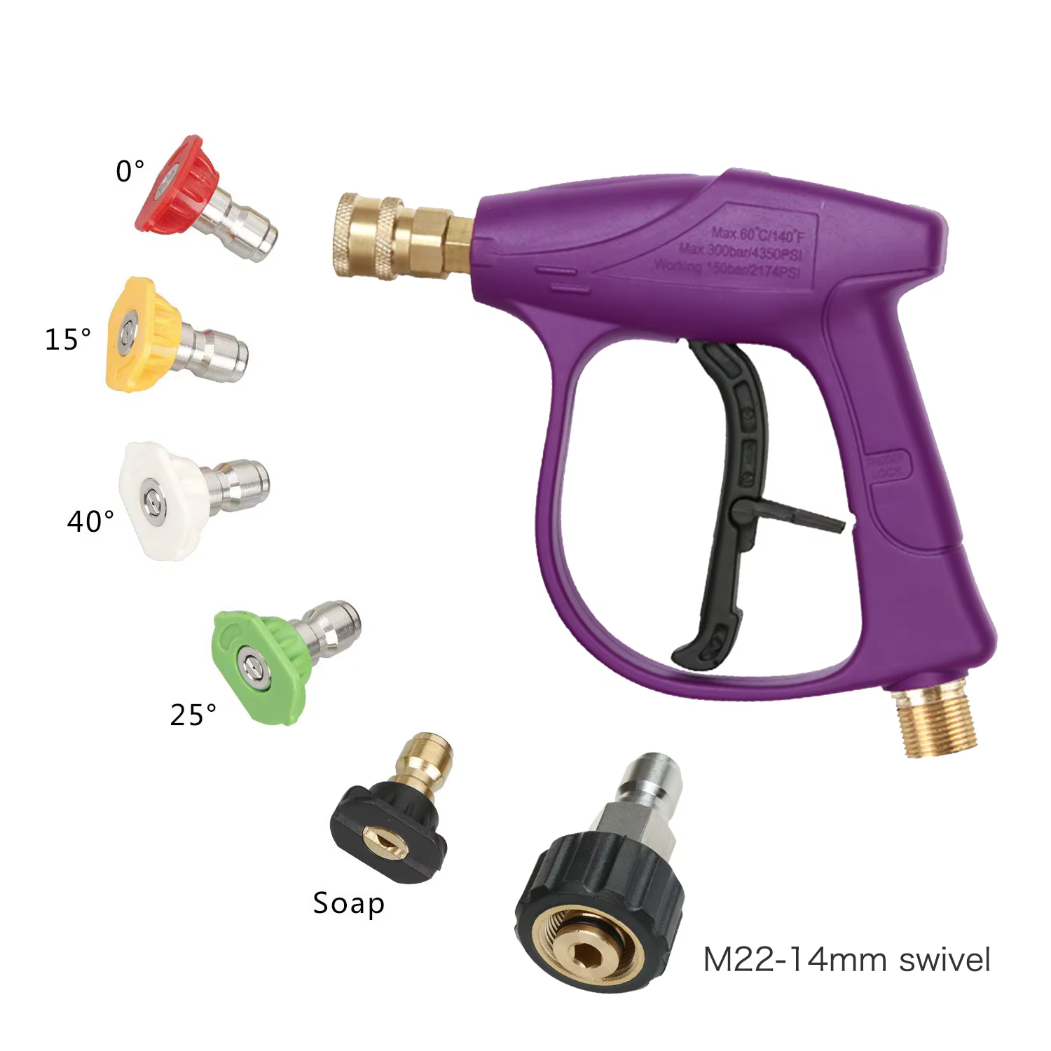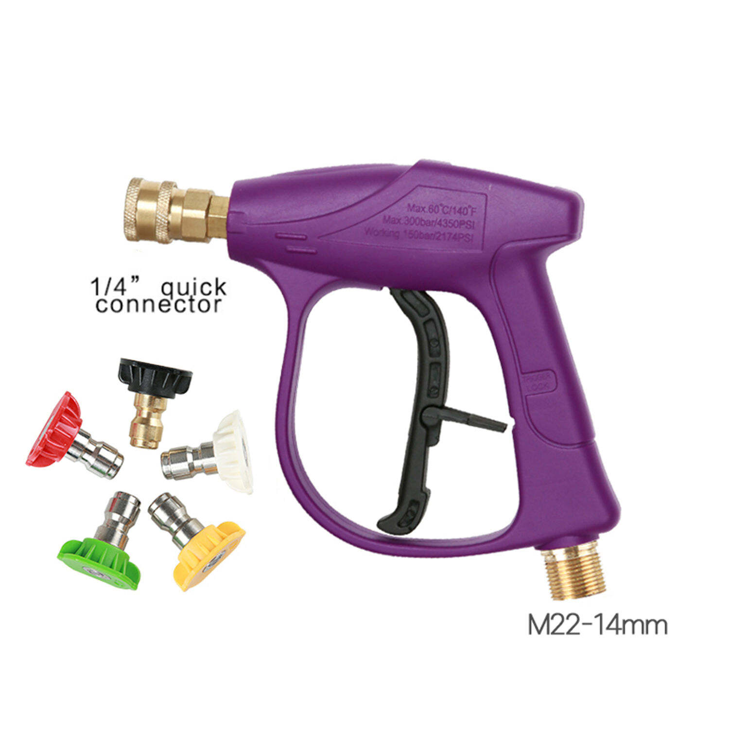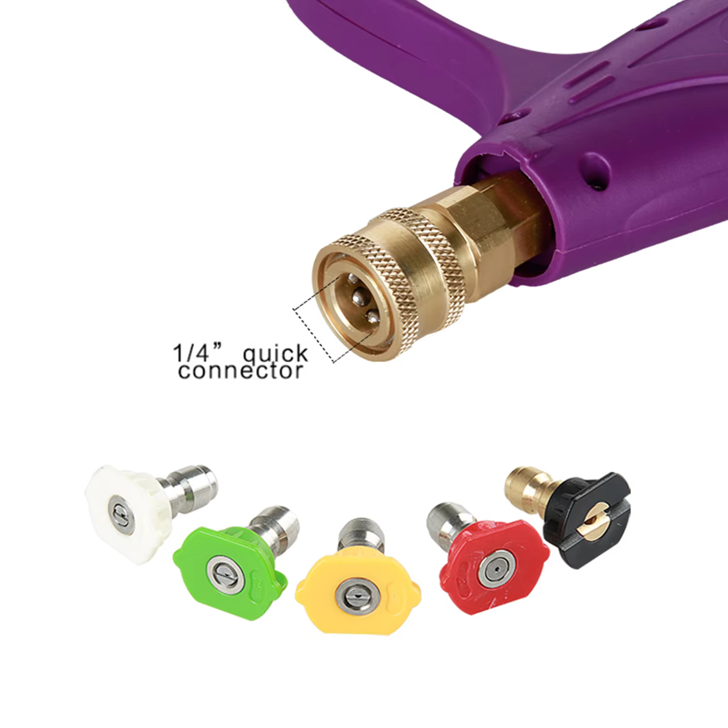หัวปืนเครื่องฉีดน้ำแรงดันสูงเป็นข้อต่อเร็วขนาด 1/4 นิ้ว สามารถต่อหัวปลั๊ก M22 14 เกลียวหมุนได้ 3/8" เข้ากับปลายปืนได้ และใช้งานได้สะดวกยิ่งขึ้น