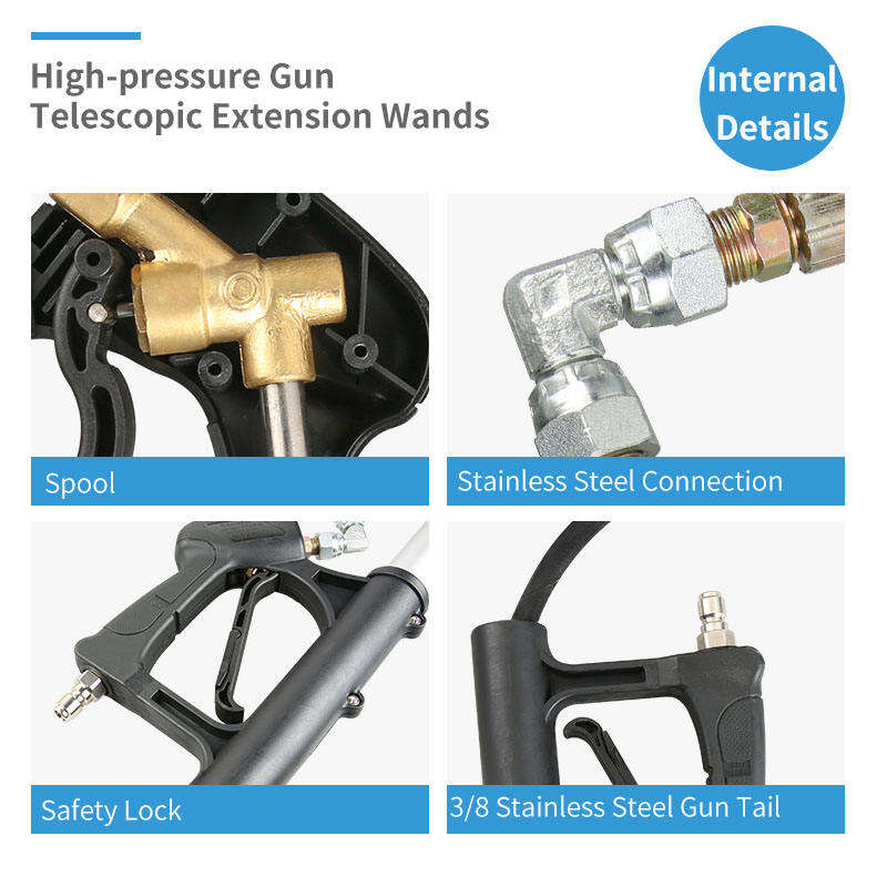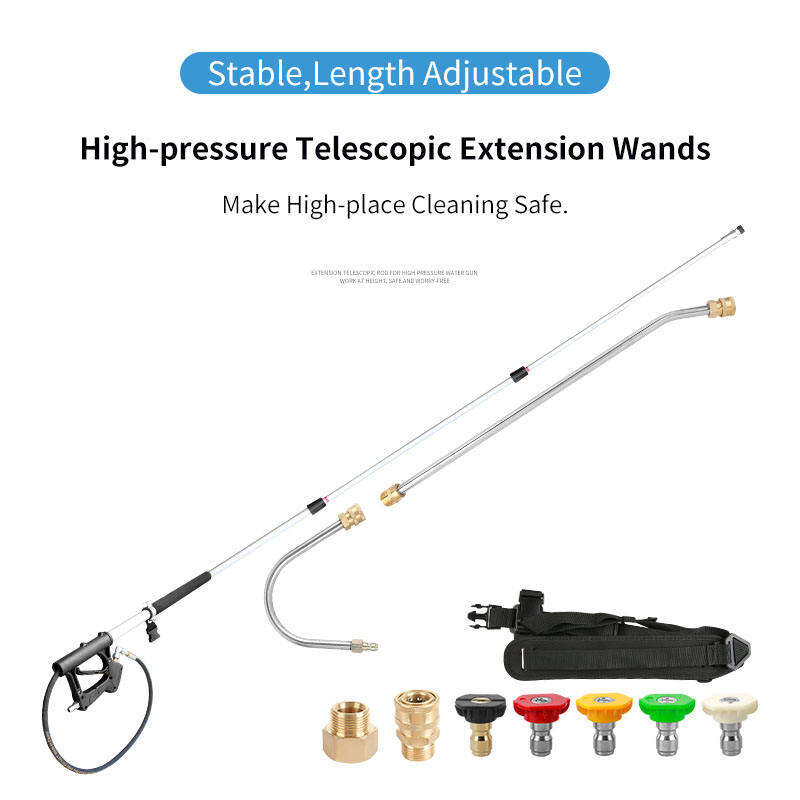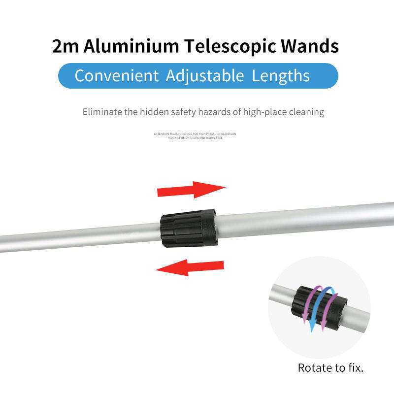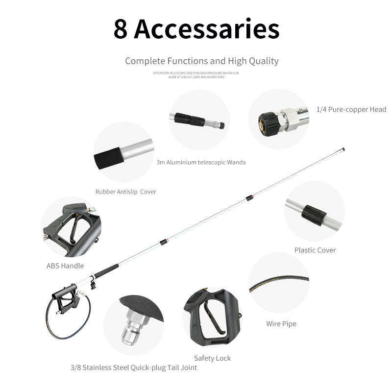 2. DIQQAT: Tirda "to'xtat" so'zi paydo bo'lganda, tiri cho'zishni to'xtating. Agar tiri hajmi oshgan holda cho'zish davom ettirilsa, ishlayotganda plastik qulf shikastlanishi mumkin. 3. Bosimli chelakchali teleskop tir yengil, lekin mustahkam alyuminiydan yasalgan. Buni boshqarish va tozalashni osonlashtiradi. Gorizontal tozalagich biriktirmasi yerda xavfsiz turib gorizontlarni tozalash uchun ishlatiladi. Uni teleskopik bosimli chelakchali turga ulang, keyin ular yerda gorizont tozalagich sifatida ishlaydi. 4. Universal bosimli chelakcha ehtiyot qismlariga turbo nozzil hamda 5 ta purkutish nozzillari kiradi. Deyarli barcha brendlarning 1/4” tez ulanadigan uloqtirishli bosimli chelakcha tirlari yoki pistoletlariga mos keladi.